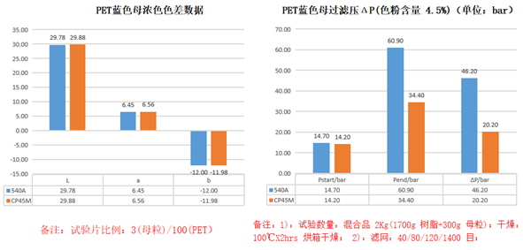 2、在PET藍色色母粒里面,CP45M過濾壓ΔP明顯比540A小,說明在PET藍色色母粒里面CP45M的分散性更佳。