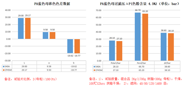 1、在PA6藍色色母粒里面,CP45M和540A過濾壓ΔP幾乎一樣,表明兩個產品在PA6藍色色母粒里面的分散性一樣。