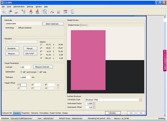 汽巴精化公司Colibri電腦測(cè)色配色系統(tǒng)是目前世界上可靠的配色軟件。因?yàn)樗褂玫男吕碚撃P蚆ulti-Flux,計(jì)算的是各種顏料或樹(shù)脂的絕對(duì)光學(xué)數(shù)據(jù),不管是透明/半透明/實(shí)色均具有良好的配色精度,適用于不同底材不同膜厚的配色。